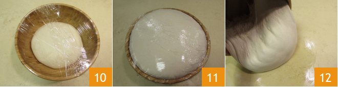 Cover with plastic wrap 10 and let it rise for an hour at room temperature, away from drafts. After an hour, transfer it to the refrigerator and let it mature for 18 hours 11, then transfer it to a slightly oiled surface 12.