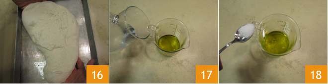 Place a piece of dough inside each tray 16 and wait 30 minutes. Meanwhile, prepare the brine by mixing oil, water 17, and salt 18 in a small bowl.