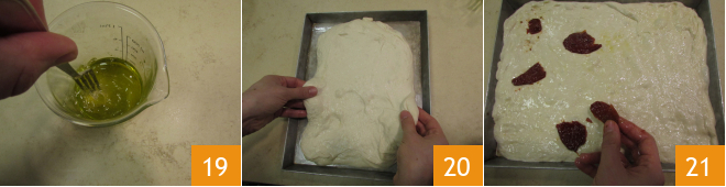 Mix with a fork to create the emulsion 19, then start spreading each focaccia with your hands 20. If the dough is resistant, let the focaccia rest a few more minutes and then continue stretching it. Top the two focaccias with sun-dried tomatoes 21,