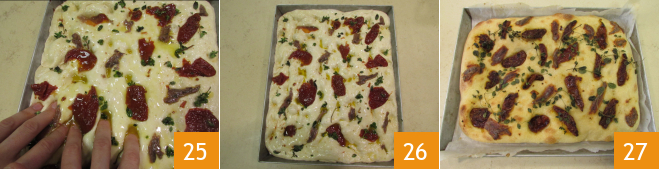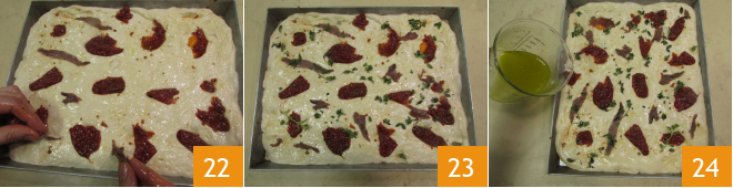 anchovies 22, and fresh oregano 23. Let rise for another 30 minutes. Pour the brine, dividing it over the two focaccias 34.