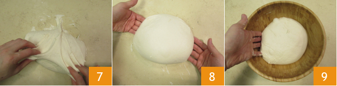 When the dough is well combined, transfer it to a surface, fold it 7 and round it up 8. Then, after shaping it into a ball, place it in a bowl 9