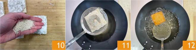 Cover with sesame seeds 10 so they adhere well to the cream. Heat the seed oil in the wok 11, then immerse the toasts 11. It's preferable that they fry first "face down" and then on the other side. When the toasts are golden on both sides, drain them 12.