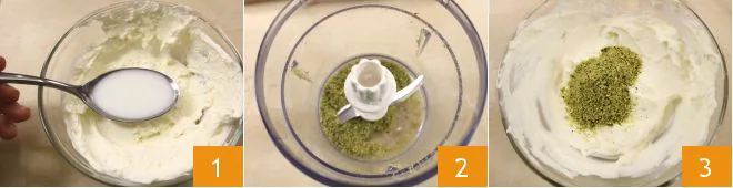 To prepare the olive breadsticks wrapped in mortadella and robiola, start by making the cream: place the robiola in a bowl, add a tablespoon of milk and mix until a thick consistency is obtained 1. Chop the shelled pistachios in a mixer 2 and incorporate them into the robiola cream 3.