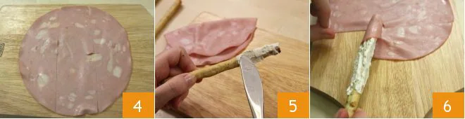 At this point, lay out the slices of mortadella and cut 3 strips from each slice 4. You can now assemble the snacks: take the olive breadsticks, spread them with the robiola cream (leaving a couple of inches free at one end to hold them) 5 and wrap them with a strip of mortadella 6: the olive breadsticks wrapped in mortadella and robiola are ready to be enjoyed.