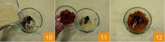 Meanwhile, place the pistachios, breadcrumbs 10, and sun-dried tomatoes 11 in a food processor with blades and chop everything 12.
