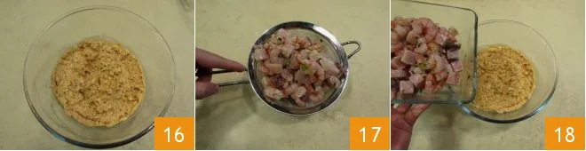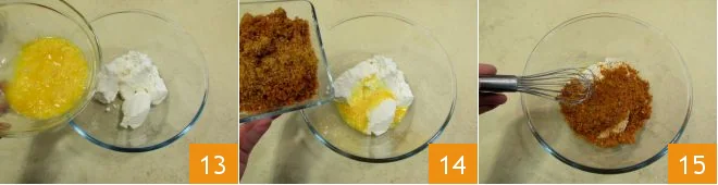 Beat the eggs in a bowl (save a small amount) and add them to the ricotta 13; also pour in the pistachio and breadcrumb mixture you prepared (reserving 3 tablespoons) 14 and mix with the beaters 15