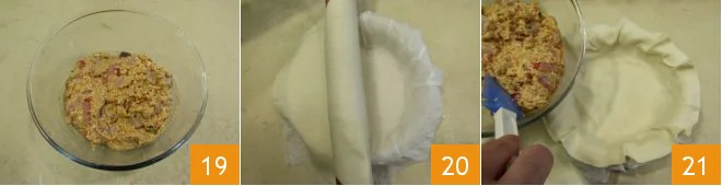 Mix with a spatula 19, then roll out the puff pastry with the help of a rolling pin in a 10-inch diameter tart pan lined with parchment paper 20. Pour the filling, distributing it evenly 21