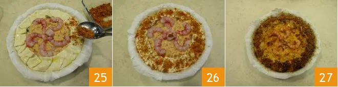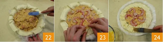 and leveling it with a spatula 22. Gently fold the edges 23, then decorate the surface with the shrimp you set aside. Brush the edges with the beaten egg 34