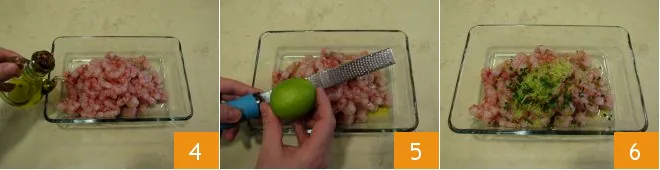 Place the cleaned fish in a baking dish (set aside 5 shrimp for the final decoration), pour the oil 4, add the grated lime zest 5 and the finely chopped chives 6.