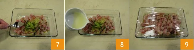 Add the white pepper 7, a pinch of salt, and the lime juice 8 and mix well with a spoon; cover with plastic wrap and let marinate for at least 30 minutes 9.