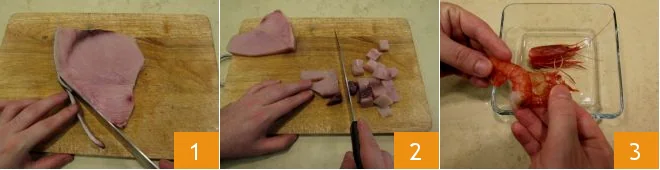 To prepare the puff pastry with swordfish and shrimp, remove the skin from the swordfish using a knife 1. First cut the fish into strips and then into small cubes of 1/5 inch 2, then proceed with the How to clean shrimp: remove the head, the shell 3, then gently extract the intestine with your fingers or with a toothpick.