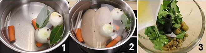 To prepare the olive puff pastries with green chicken salad, start by placing in a pot with plenty of cold water 1 carrot, peeled and halved, 1 onion, peeled and halved, bay leaves, and cloves 1. When the water starts to boil, add the whole chicken breast and coarse salt, then cook for about 20 minutes 2. Drain the chicken and let it cool on a cutting board; in the meantime, prepare the green sauce 3: put basil, parsley, capers, olives, garlic, oil, and lemon juice in a mixer. Blend finely and adjust the salt. If the mixture is too thick, add 1 tablespoon of water.