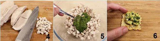 Cut the cooled chicken breast into small cubes 4 and dress them with the green sauce 5, mixing well to combine the ingredients. Finish by placing a spoonful of green chicken salad on each olive puff pastry.