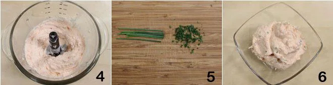 You should achieve a creamy consistency 4. Finely chop the chives 5 and incorporate them into the mousse 6, then place the mixture in a piping bag with a star nozzle.