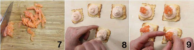 At this point, julienne the remaining salmon 7 and start assembling the snacks: pipe a dollop of salmon cream on each cracker 8 and arrange some pieces of smoked salmon 9.