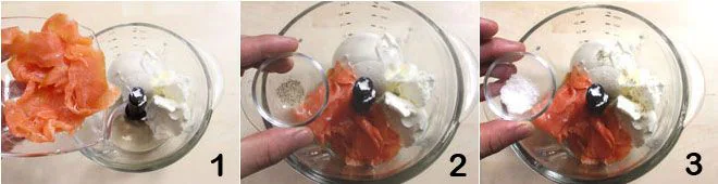 To prepare the classic puff pastries with quark and smoked salmon, start by preparing the salmon mousse. In a mixer, blend the quark cheese with 2.8 oz of salmon 1, a pinch of white pepper 2, and a pinch of salt 3, just enough to season.