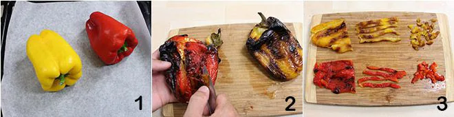 To prepare the olive puffs with ricotta and grilled peppers, wash the peppers thoroughly and grill them in a convection oven at 482°F for 20 minutes 1. When they are ready, peel them, remove the seeds 2, and cut them into strips, then into cubes, keeping some strips aside for the final decoration 3.