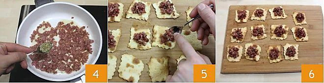 Add the fennel 4, mix thoroughly, and continue cooking for a couple more minutes at most. Now take the pastries and garnish them with a teaspoon of fennel sausage 5: your puff pastries with sausage crumbles are ready 6!