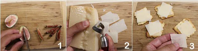 To prepare the classic puff pastries with figs, parmesan, and honey, start by washing the figs well and cutting them into rather thin wedges 1. With the help of a peeler, make parmesan cheese flakes 2 and place a couple on each pastry 3.