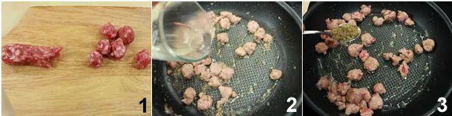 To prepare the pastries with crispy luganega and stracchino, start by cutting the luganega into many small cubes 1. In a small pan, heat the oil and fry the luganega. When it starts to color, deglaze with the wine 2 and add the fennel seeds 3,
