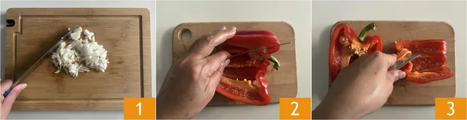 To prepare the shakshuka, start by peeling the onion and finely chopping it 1, then wash the pepper, cut it in half 2, and remove the stem, seeds, and inner filaments 3.