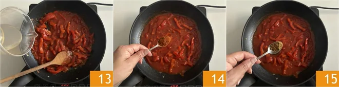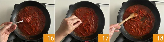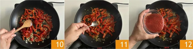 At this point, after giving it a stir 10, add a pinch of chili pepper 11 and the tomato puree 12.