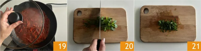 Now cover with the lid, continue cooking over low heat for about 20 minutes, stirring occasionally 19. Now wash and chop a bunch of parsley (or cilantro) 20 and set it aside, you will need it at the end of cooking 21.