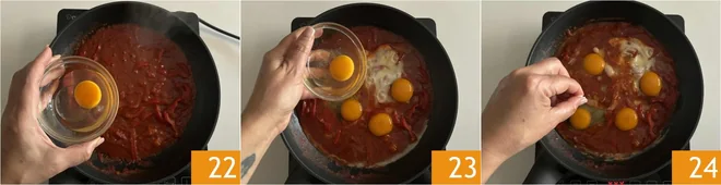 All that remains is to pour the eggs one at a time 22, being careful not to break the yolks 23, cook them for about 3 or 4 minutes, at the end of cooking, the white should be white and the yolk very creamy. Adjust the salt 34.