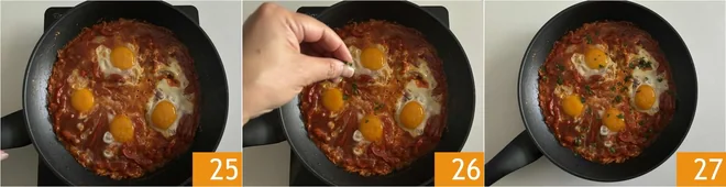 Once the eggs are ready 25, add the freshly chopped parsley 26, turn off the heat, and serve the shakshuka hot 27.