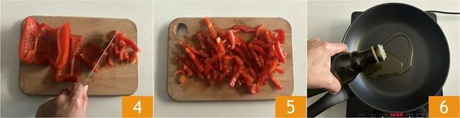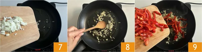 Next, start to cook the chopped onion 7, let it soften on low heat 8, and add the peppers 9.
