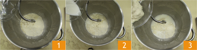 To prepare the sheet pan pizza with liquid sourdough starter, first pour the flour, room temperature water 1, and milk (whether cold or warm, it won't change) 2 into the bowl of a stand mixer equipped with a dough hook, then add the liquid sourdough starter 3.