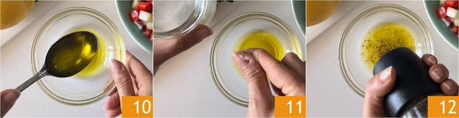Proceed with the dressing: pour the oil into a small bowl 10, add salt 11 and pepper 12.