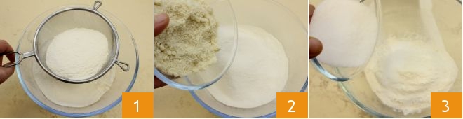 To prepare the shortbread, first sift the all-purpose flour 1, place it in the bowl of a mixer (or in a simple bowl if you are kneading by hand) and add the almond flour 2; finally add the sugar to the two flours 3.