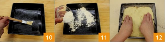 In the meantime, prepare a shallow 9x9 inch pan: butter it 10, flour it 11, and fill it with the dough taken from the refrigerator 12.