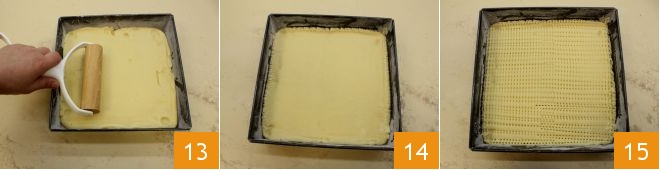 Level the surface with a small rolling pin 13 and make sure it is even and well spread to the corners 14. Proceed by covering the pan with plastic wrap and place it in the refrigerator for another 30 minutes. After half an hour, take the pan out of the refrigerator and, using the tines of a fork, prick the entire surface of the dough in the typical shortbread decoration 15.