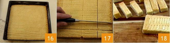 You can now proceed with baking: place it in a preheated static oven at 350°F for 30 minutes (if convection, at 320°F for 20 minutes). After the necessary time, take out the base, which should have a light golden color 16. Turn it out onto a cutting board while it's still warm and while the dough is still warm, divide it into rectangles of about 1x3.5 inches using a sharp knife or a pastry wheel 17. Separate the cookies from each other and let them cool completely 18. The shortbread is ready, and you can serve it once it has completely cooled.