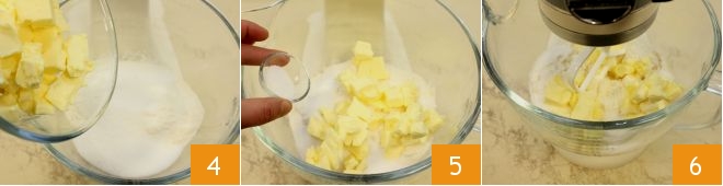 Now cut the cold butter into pieces and add it to the flour and sugar mixture 4, also add the salt 5 and start kneading with the paddle 6.