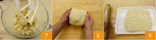 When the dough is smooth and homogeneous 7, turn it out onto a work surface and shape it into a block 8. Flatten it slightly and wrap it in plastic wrap, then place it in the refrigerator for an hour 9.