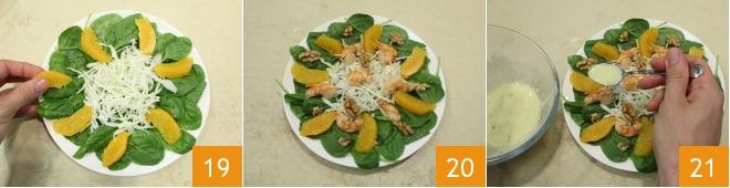 arrange the peeled orange slices in a circle on the edge 19 and place a few walnut halves between the segments 20, distribute the shrimp over the salad, and finally, dress with the sauce 21, also to be served on the side. The shrimp salad with yogurt sauce is ready to be enjoyed!
