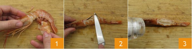 To prepare the shrimps in kataifi pastry with asparagus sauce, first clean the shrimps: remove only the shell while keeping the head and tail 1. Cut along the back and remove the intestine, which is the black thread 2. Add salt 3 and pepper.