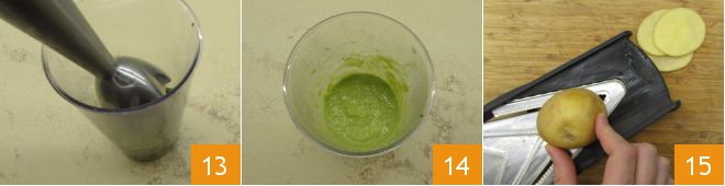Blend everything with an immersion blender 13 until you get a smooth cream 14. Set aside and take care of the potatoes: slice them with a mandoline to a thickness of 1/16 inch 15.