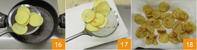 Everything is ready for frying: heat the oil to 340°F, then immerse the potatoes 16 for a couple of minutes, then drain them on a tray lined with paper towels (17-18).