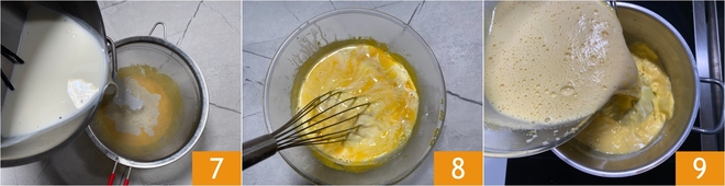 Pour the hot milk, strained through a sieve, into the bowl 7 and stir gently to combine 8, then return the mixture to the saucepan 9.<\/p>