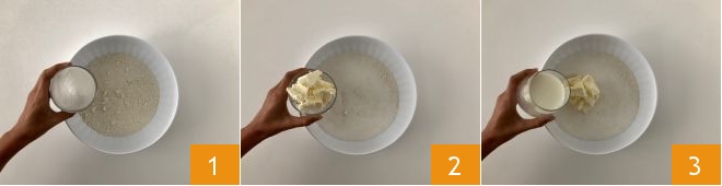 To prepare Sicilian taralli, first, place the all-purpose flour in a bowl and add the sugar 1. Add the cubed butter 2 and the milk at room temperature 3.