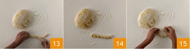 Break off a piece weighing about 2.6 ounces 10 and roll it into a stick with your hands 11. Then fold it in half 12.
