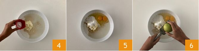 Then add the baking powder along with the ammonia 4 and the eggs 5. Grate the zest of a lemon inside 6.