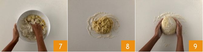 Knead everything by hand 7. When you have obtained a homogeneous mixture, transfer it to a floured surface 8 and continue kneading until you have a dough similar to shortcrust but softer 9.