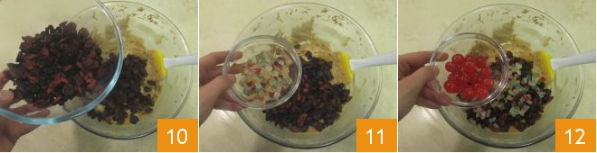the dried red fruits 10, mixed candied fruit 11, and candied cherries 12.