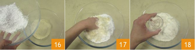 In the meantime, prepare the marzipan: pour the almond flour and powdered sugar into a bowl 16 and mix thoroughly with your hands 17, then add the bitter almond essence 18.