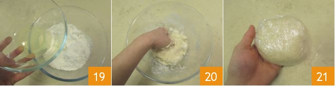 Add the egg whites 19 and work with your hands to combine everything well 20. Form a dough that you can divide into two parts, then wrap in plastic wrap 21 and let it firm in the refrigerator for at least one hour.
